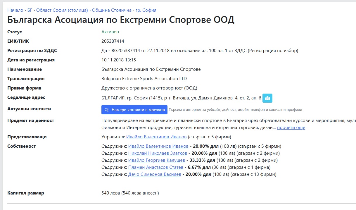 Справка в Търговскя регистър показва, че мъже с имена Ивайло Калушев, Ивайло Иванов, Дечо Василев и Пламен Статев са съдружници в Българска Асоциация по Екстремни Спортове ООД. Най-голям дял в асоциацията има Ивайло Калушев.