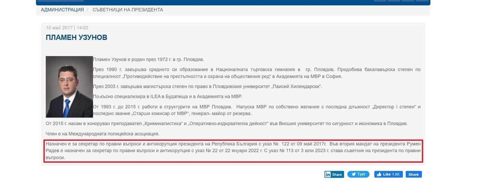 Съветниците нямат достъп до квалифицирана информация Радев има общо ПЕТ съветника по правни въпроси и един секретар Крум Зарков. НЯМА длъжност с приоритет АНТКОРУПЦИЯ след служебния кабинет в Президентската администрация или поне според сайта на Президента на Република България ПЛАМЕН УЗУНОВ е назначен е за секретар по правни въпроси и антикорупция президента на Република България с указ № 122 от 09 май 2017 г.