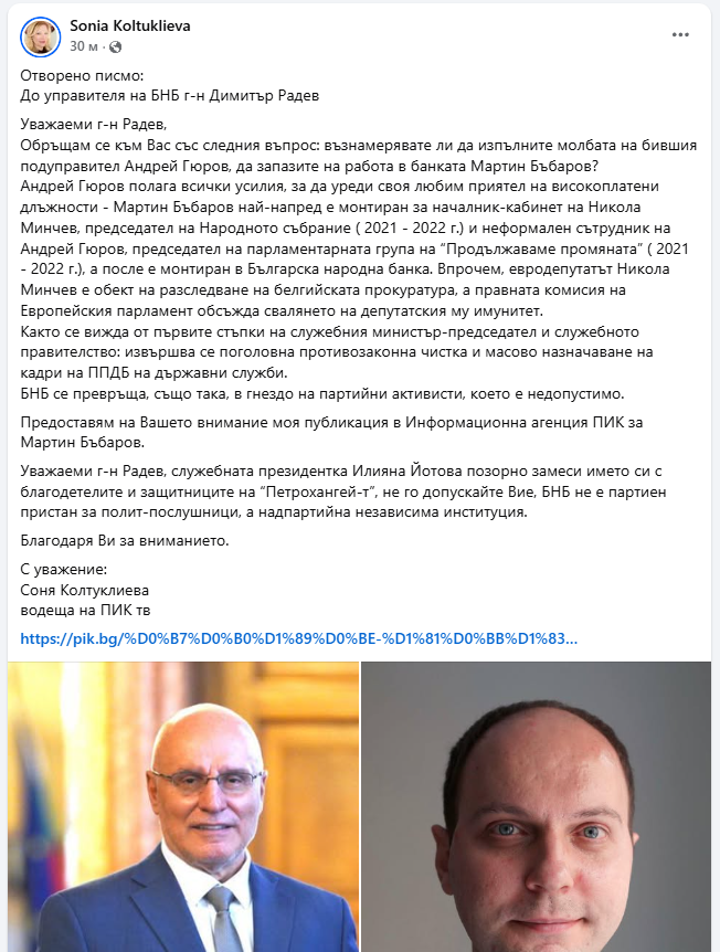 Отворено писмо до управителя на БНБ Димитър Радев написа Соня Колтуклиева. Водещата на ПИК TV настоява да разбере дали Радев смята да удовлетвори молбите на новия служебен министър Андрей Гюров в институцията на работа да остане Мартин Бъбаров.