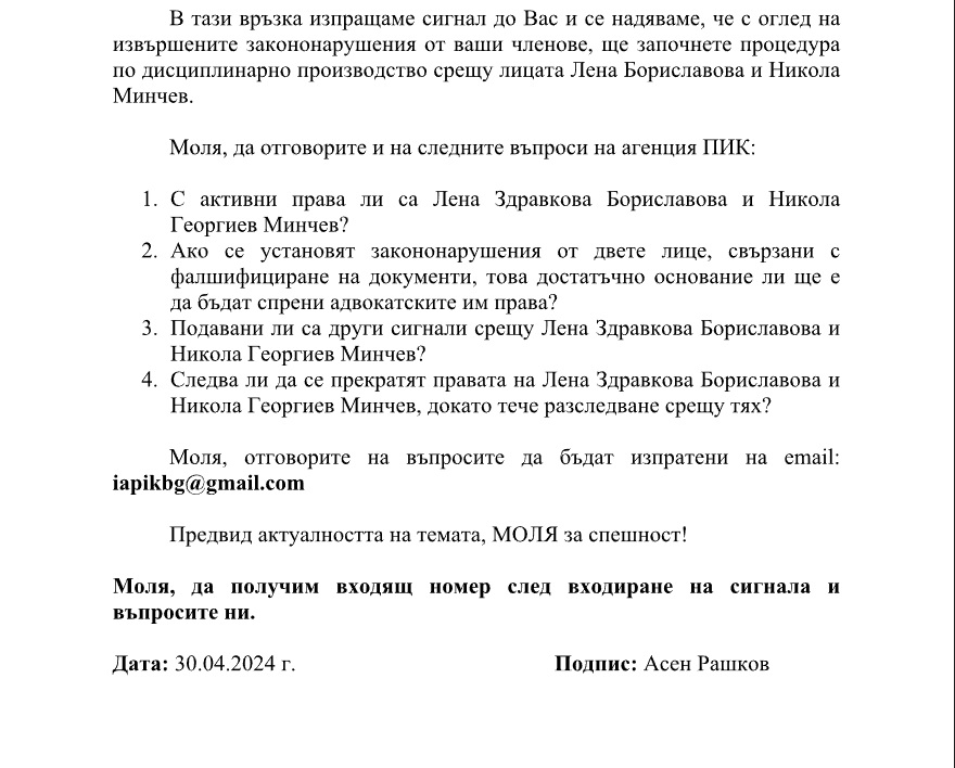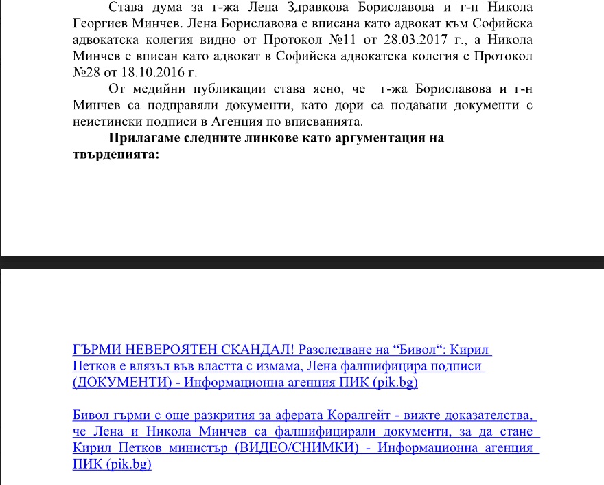 Лена Бориславова и Никола Минчев да бъдат обект на образуване на дисциплинарно производство с оглед на изнесените данни за закононарушения, свързани с подправяне на подписи и фалшифициране на документи. Това се казва в сигнал на агенция ПИК до Софийската адвокатска колегия и до Висшия адвокатски съвет.