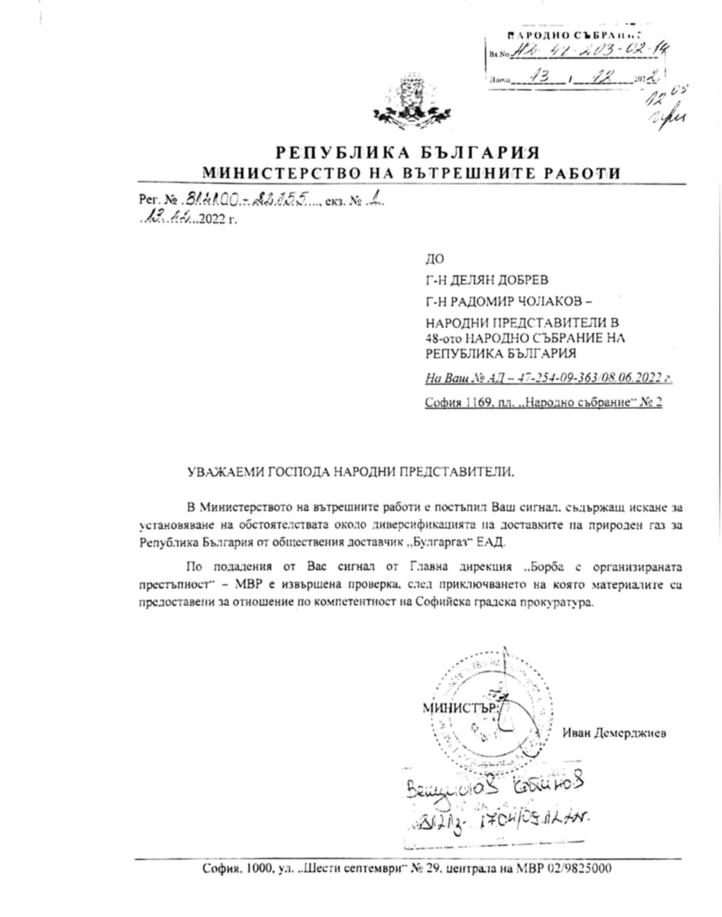 „Получих отговор от министър Демерджиев, че по сигнала ни за далаверите с газа, Главна дирекция "Борба с организираната престъпност" е извършила проверка и изпраща материалите по компетентност в Софийска градска прокуратура”, пише той.