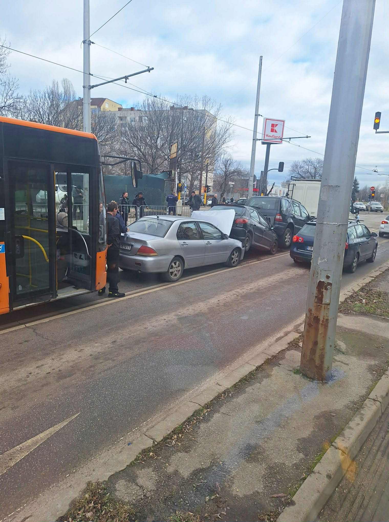 Четири коли бус и автобус на градския транспорт се удариха във верижна катастрофа днес по обяд, видя ПИК.