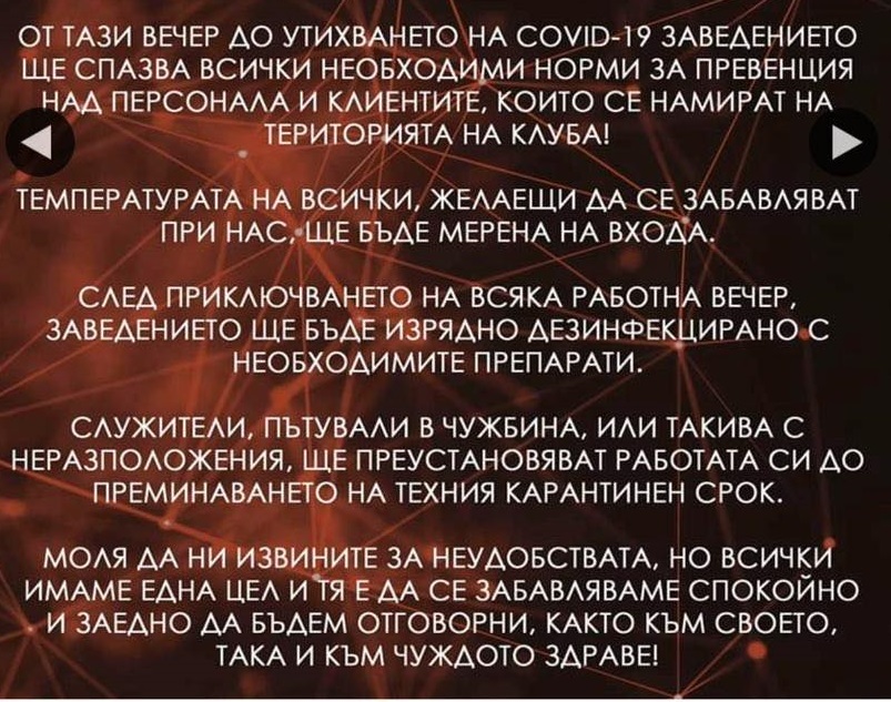 Персоналът ще работи с маски и ръкавици, а клубът ще се дезинфекцира ежедневно, както бе разпоредено от здравните власти. Клиентите пък на входа ще бъдат проверявани с термометър, става ясно още от съобщението.
