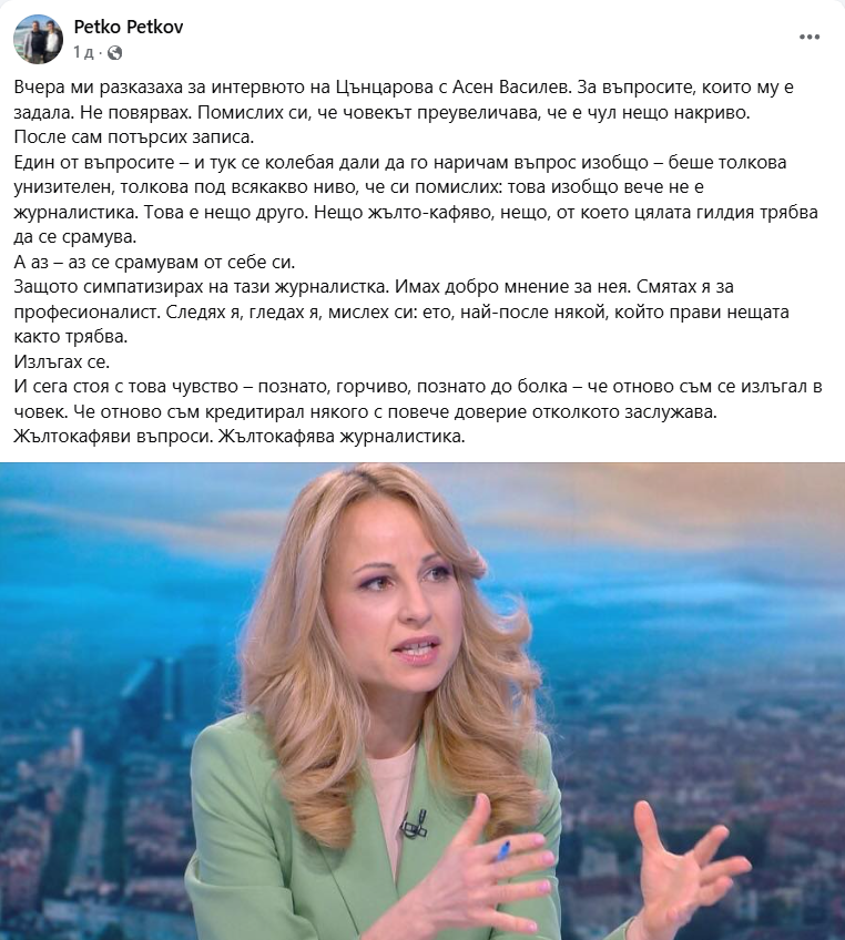 "Вчера ми разказаха за интервюто на Цънцарова с Асен Василев. За въпросите, които му е задала. Не повярвах. Помислих си, че човекът преувеличава, че е чул нещо накриво. После сам потърсих записа.