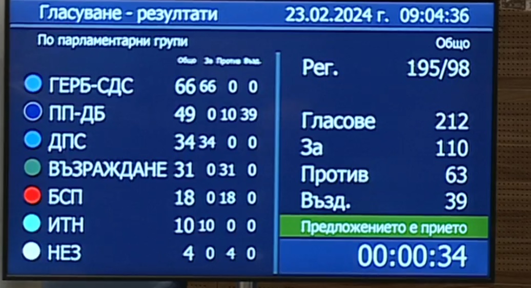 Саботажът им обаче този път не успя. Причината е, че ГЕРБ, ДПС и ИТН събраха 110 гласа "за', които бяха достатъчни, за да бъде включена точката в дневния ред. От ППДБ гласуваха едва 49 души от 63. Заедно с БСП и "Възраждане" те събраха 102 гласа. Така заради отсъстващите депутати на Кирил Петков и Христо Иванов се стигна до разглеждането на точката в зала.