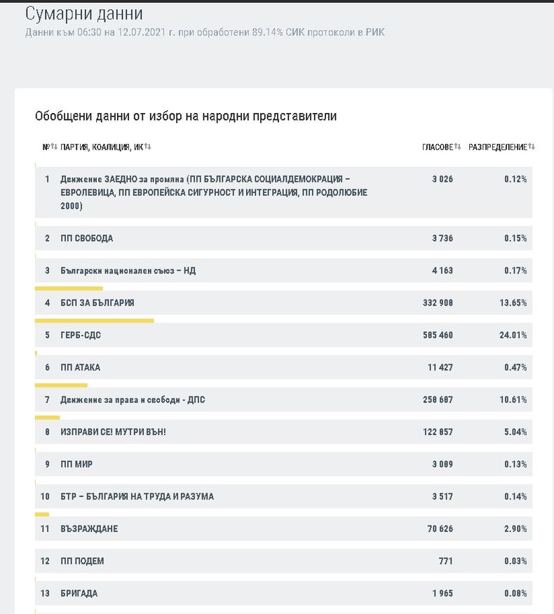 Централната избирателна комисия (ЦИК ) публикува обобщени данни към 06:30 часа при обработени 89.14% СИК протоколи в РИК.