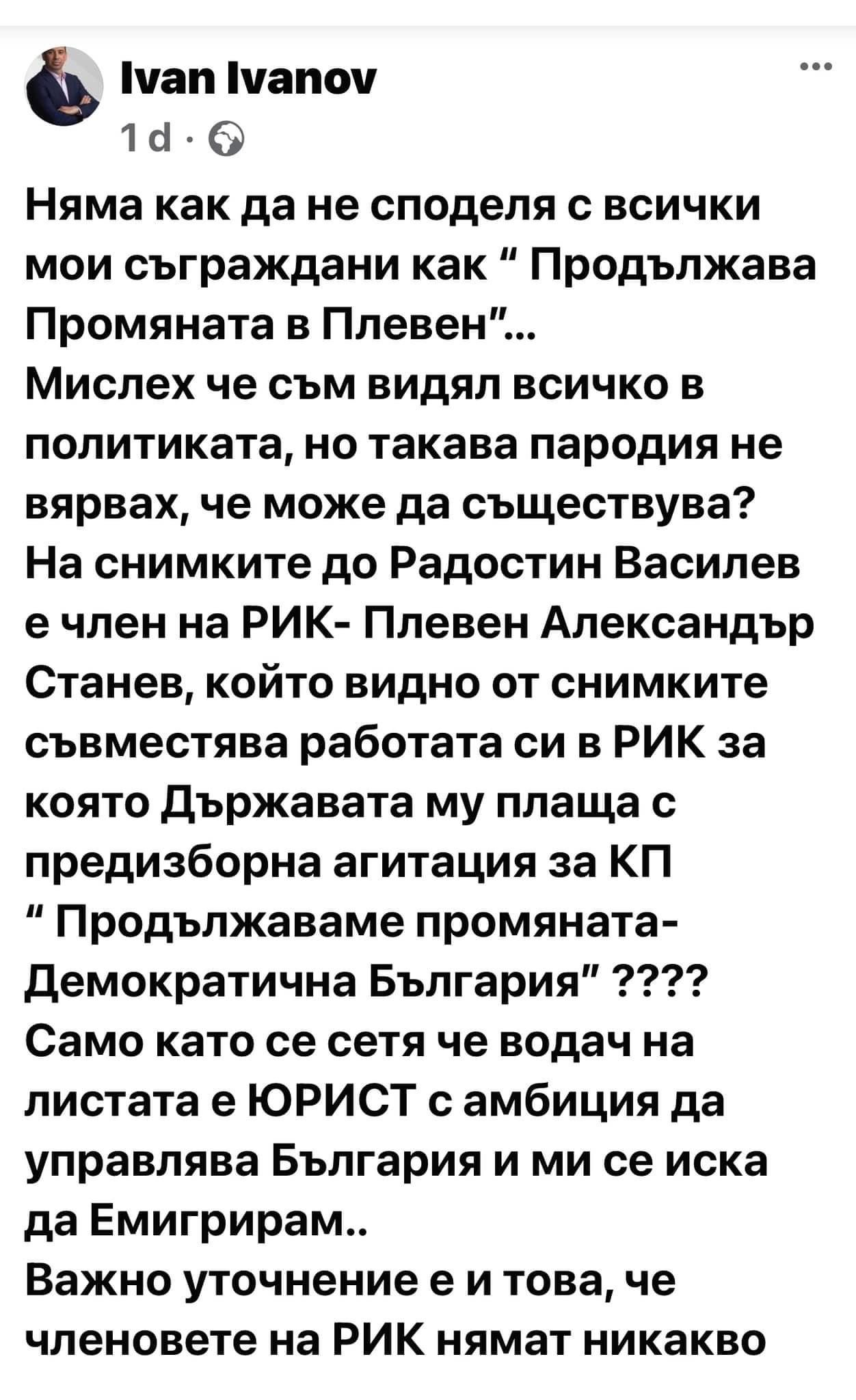 От публикации в социалната мрежа Фейсбук става ясно, че Александър Стефанов Станев, член на Районната избирателна комисия в 15 МИР-Плевен, грубо нарушава Изборния кодекс като участва в акции с цел предизборна пропаганда на листата на коалиция “Продължаваме промяната”-“Демократична България”, водена от Радостин Василев.