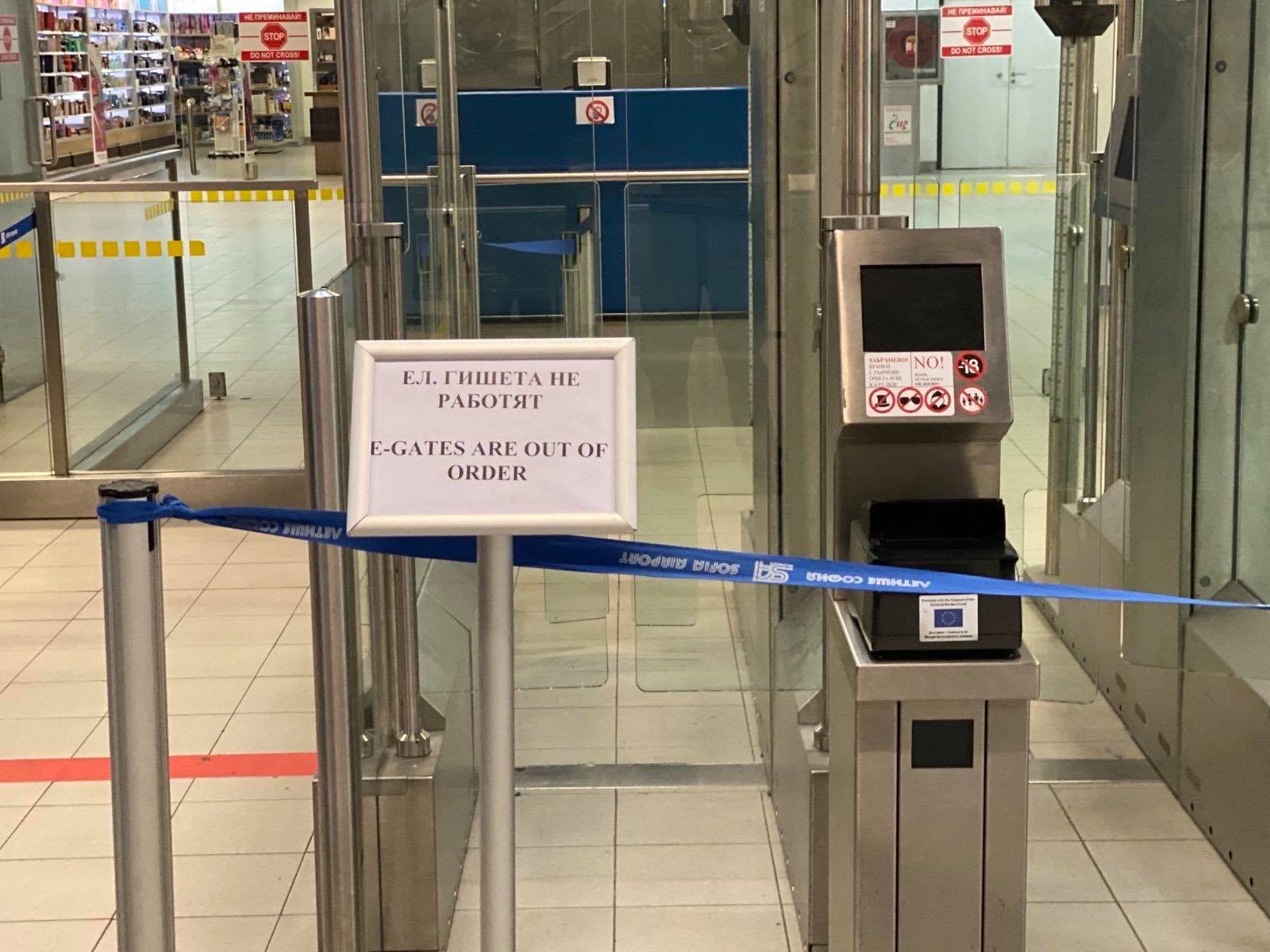 Не работят електронните гишета, които улесняват проверките на влизащите пътници. Вместо това ги посрещат табели "Ел. гишетата не работят" на български и английски.