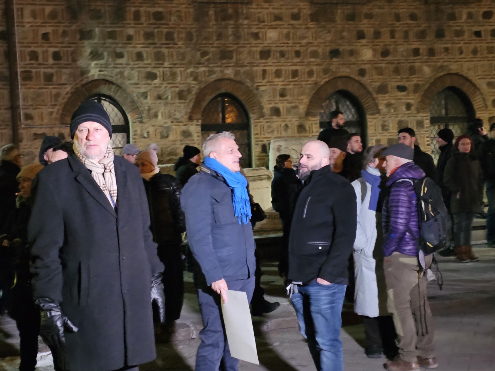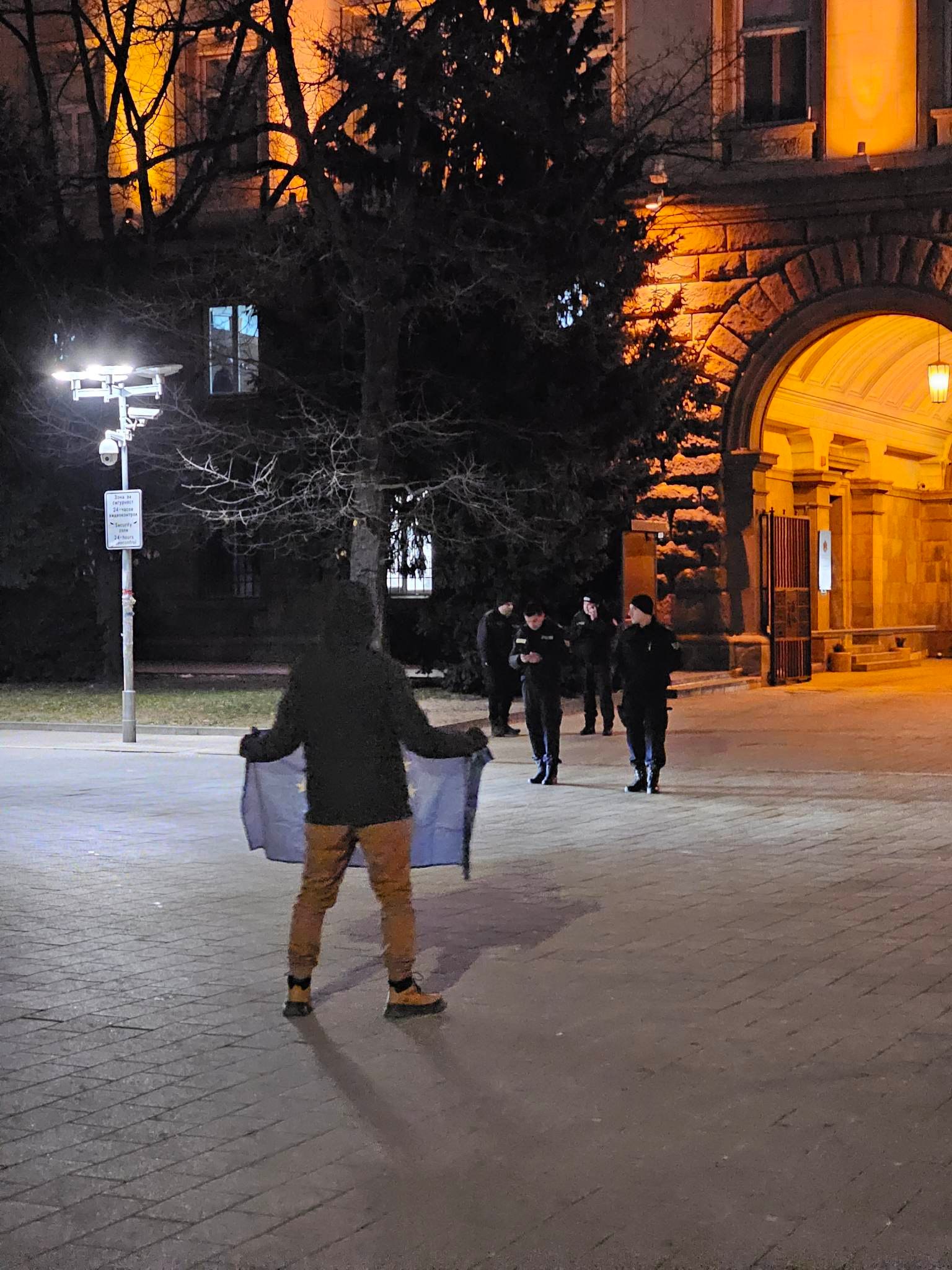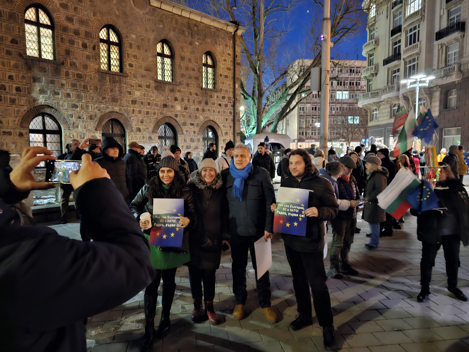 Позабравеното лице от ранните години на СДС Едвин Сугарев също взе думата: "Бил съм на този площад преди 30 и кусур години. Студено е, но ще стане по-топло, ще бъдем повече. А на господин Радев ще му стане горещо. Защото имаме един президент, който не зачита Конституцията и който е болна душа. Какво значи "Няма да се намесваме, за да не влезем във войната"? И какво значи това да бъдем против санкциите на ЕС във войната на Украйна срещу Русия. А кои ще бъдат следващите, които ще бъдат нападнати? Няма ли и ние да сме сред тях? Слава на Украйна и свобода на България".