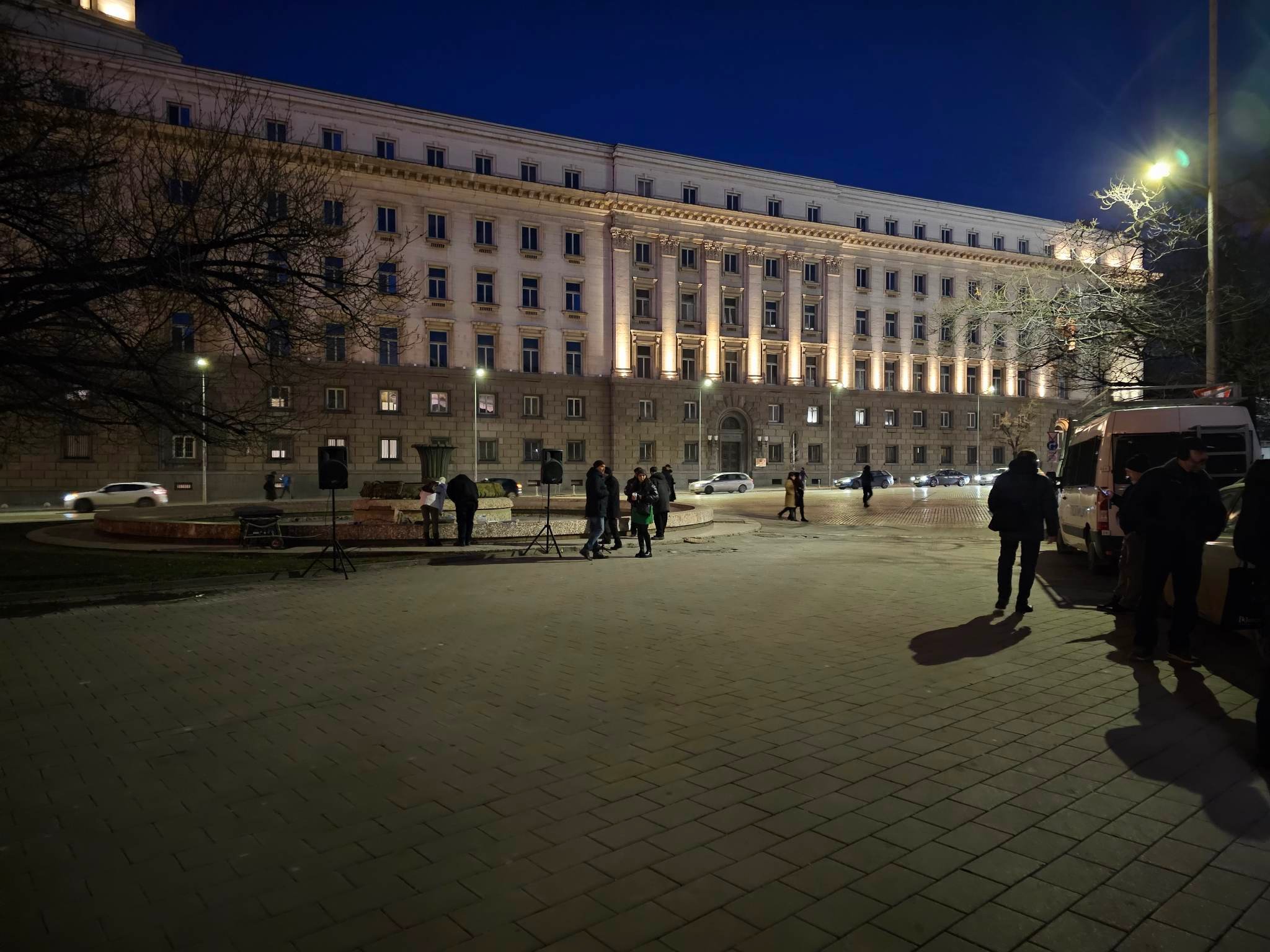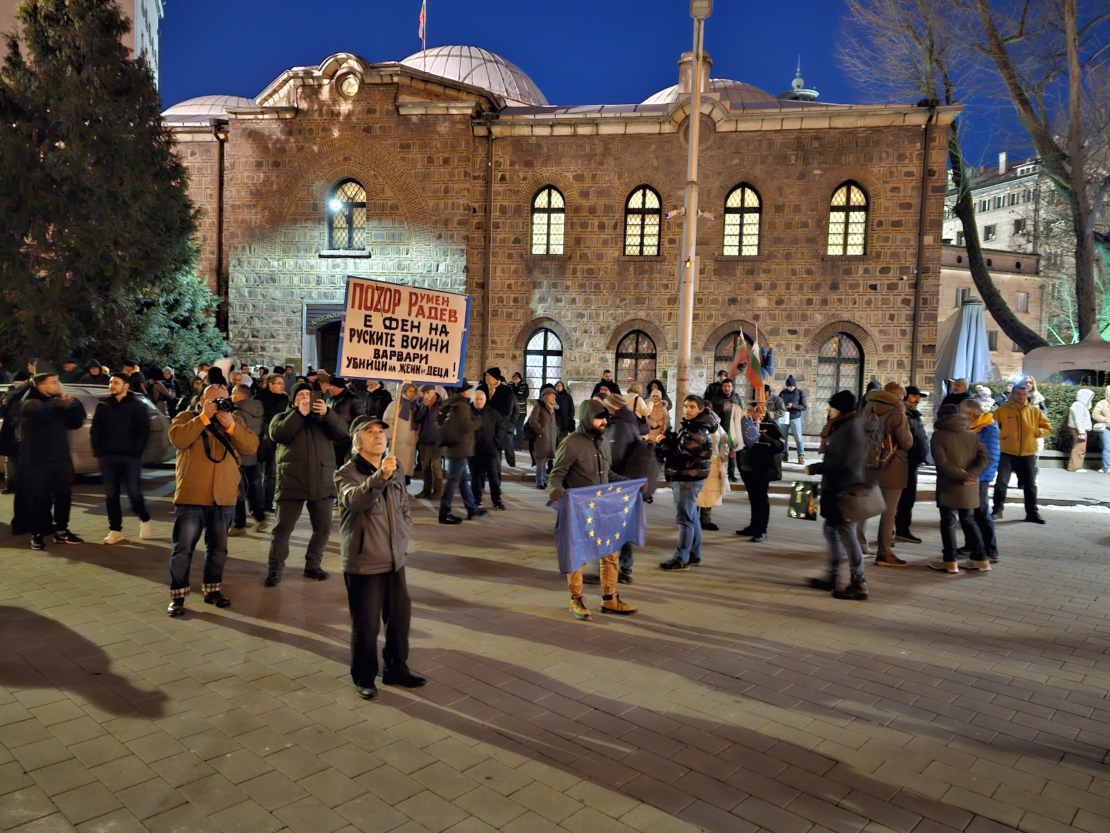 С доста закъснение от първоначално обявения час пред президентството се събраха 30-50 ентусиазирани протестиращи "срещу руските агенти на влияние, които подкопават българската национална независимост и работят срещу България". "Те са в президентството, в парламента, ДАНС, полицията, армията, прокуратурата, съда, държавната администрация. Те са навсякъде", заяви пред микрофона един от дошлите.