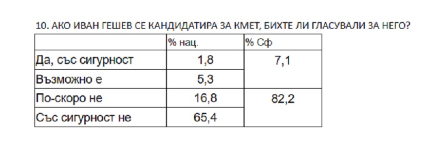 На въпрос "Ако Иван Гешев направи партия, бихте ли гласували за нея?", 7% от столичани заявяват такова намерение (сред тях 1,7% отговарят "да, със сигурност", а 5,3% отговарят с "възможно е").