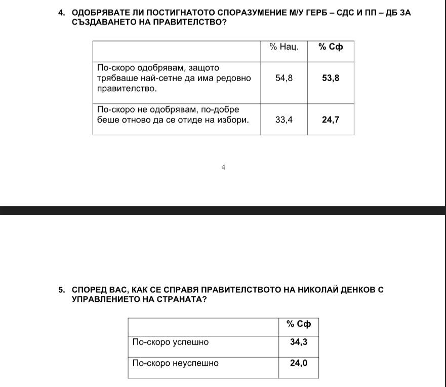 На въпрос "Как се справя правителството на Николай Денков с управлението на страната?", 34,3% от анкетираните в София отговарят с "по-скоро успешно", а 24% отговарят с "по-скоро неуспешно".