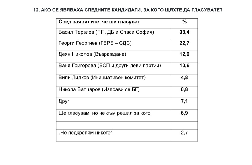 Следва кандидатът на "Възраждане" Деян Николов с 12%. Четвърта е синдикалистката Ваня Григорова, която е спрягана за фаворит на БСП - 10,6%. Широко рекламираният независим кандидат проф. Вили Лилков засега се ползва с доверието на 4,8% от столичани.