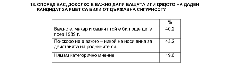Центърът на Юлий Павлов пита и дали според анкетираните е важно дали роднините на даден кандидат са били свързани с Държавна сигурност, визирайки семейството на кандидата Васил Терзиев. Според 43,2% това не е важно. "Важно" е според 40,2% от участниците в допитването.