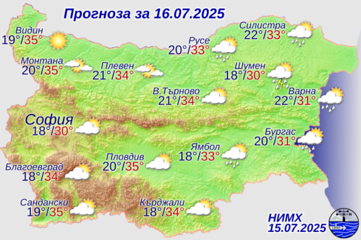 През днешния ден ще бъде предимно слънчево, с временни увеличения на облачността. След обяд над планинските райони и Източна България ще се развива купесто-дъждовна облачност и ще превали дъжд. В Лудогорието валежите ще са временно интензивни, придружени с гръмотевици, ще има условия и за градушки. Ще духа слаб вятър от запад-северозапад, в източните райони от страната от изток-североизток. Максималните температури ще са предимно между 30° и 35°, в София - около 30°. Това съобщават от Националния институт по метеорология и хидрология (НИМХ).