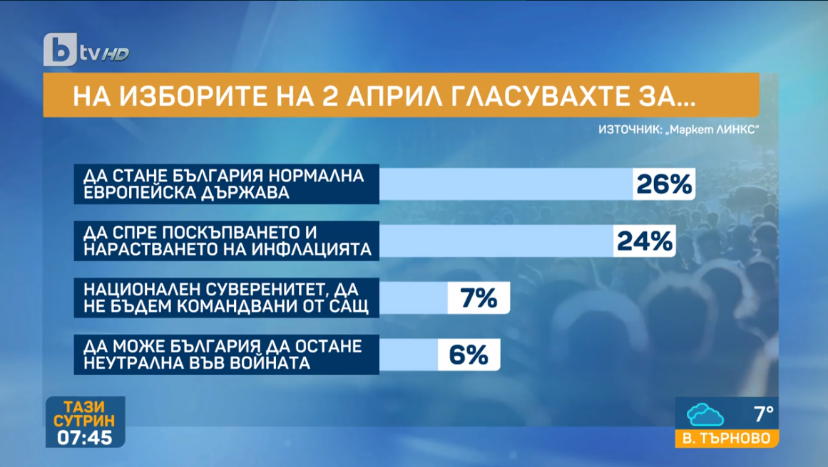„Имаме сходен резултата с този, който отчитахме преди изборите. Основният извод е, че при евентуални нови избори – дори през юли, не може да очакваме съществен срив в избирателната активност. По-скоро тя ще е сходна на тази от изборите на 2 април“, уточни Живков.