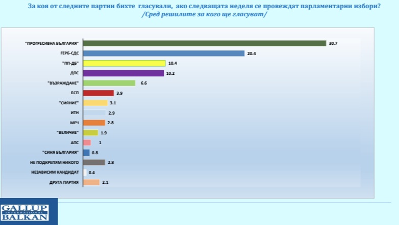 Първи сред твърдо решилите за кого ще гласуват към 16 април са „Прогресивна България“ с подкрепа от 30,7%, а втори  ГЕРБ-СДС с 20,4%.