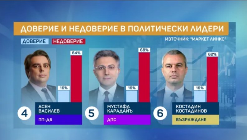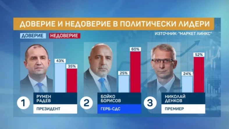 Лидерът на ГЕРБ Бойко Борисов и премиерът Николай Денков са сред фигурите с висока степен на неодобрение.