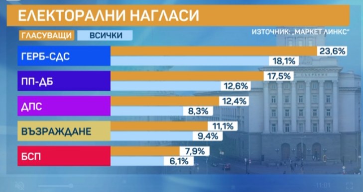 ГОРЕЩО ПРОУЧВАНЕ НА "МАРКЕТ ЛИНКС": ГЕРБ бие убедително ППДБ при избори за парламент днес - 23,6 срещу 17,5%. Борисов изпреварва по рейтинг Денков, Румен Радев на върха (ГРАФИКИ)