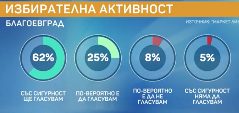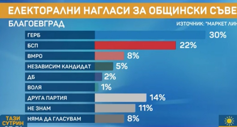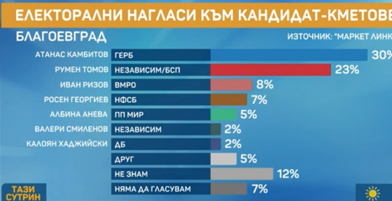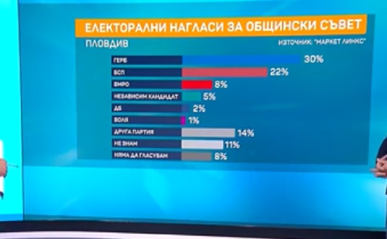Проучване на "Маркет линкс" разкри какви са електоралните нагласи за местните избори в градовете Пловдив и Бургас. В Пловдив проучването е направено в периода 21-24 септември сред 542 лица. В Благоевград е проведено експресно проучване през същия период сред 300 лица.
