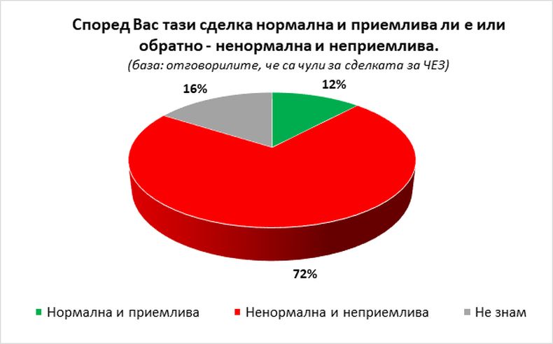На практика цялото общество вече знае за скандала около ЧЕЗ. 93% от запитаните твърдят, че са чули. 72% от чулите намират идеята за тази сделка за ненормална и неприемлива, а само 16% намират случващото се за нормално и приемливо. Останалите не могат да преценят. Общественото мнение явно еднозначно се противопоставя на случващото се.