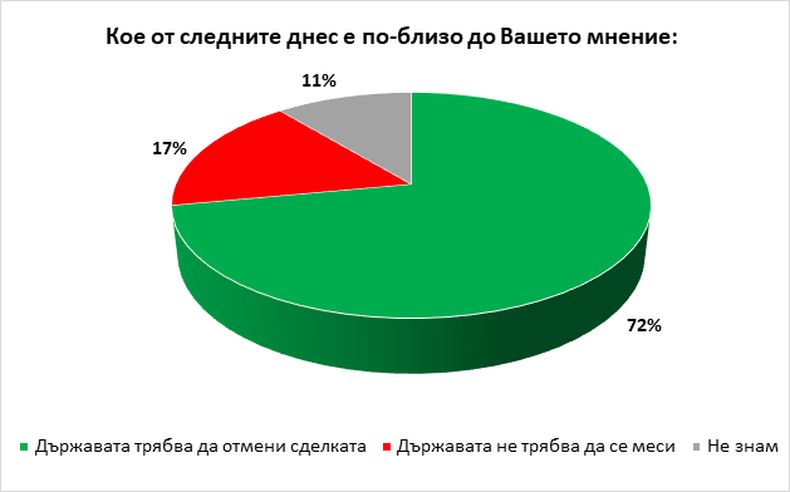 Откроява се желание за по-ясна държавна намеса. Мнозинство от 72% иска държавата да отмени сделката, а 17% смятат, че държавата не трябва да се меси. Останалите се затрудняват да формират позиция. Както може и да се очаква, преобладаващото мнение по отношение на електроразпределителното предприятие клони към идеята то да е държавна собственост. Мнозинство от 75% подкрепят идеята държавата да купи ЧЕЗ, 20% са против, а останалите се колебаят.