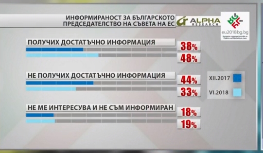 Има 2 изследвания за европредседателвтото ни - едно през декември и едно през юни. 38% от хората са казвали, че вече има достатъчно информация за европредседателството, като този процент се е увеличил на 48% за шест месеца. Това заяви социологът Боряна Димитрова от "Алфа Рисърч" в сутрешния блок на БНТ.