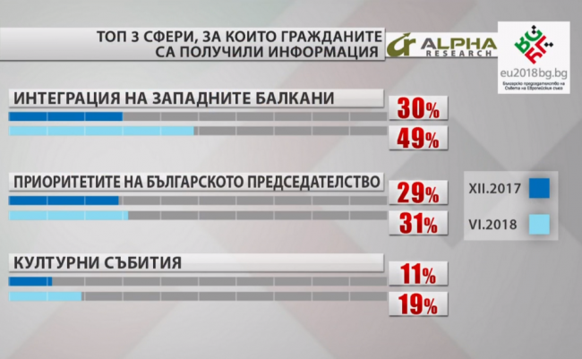 "Трите топ теми, по които хората са получили най-много информация са интеграцията и европейската перспектива на Западните Балкани, приоритетите на българското европредседателство, както и културните събития", допълни социологът.