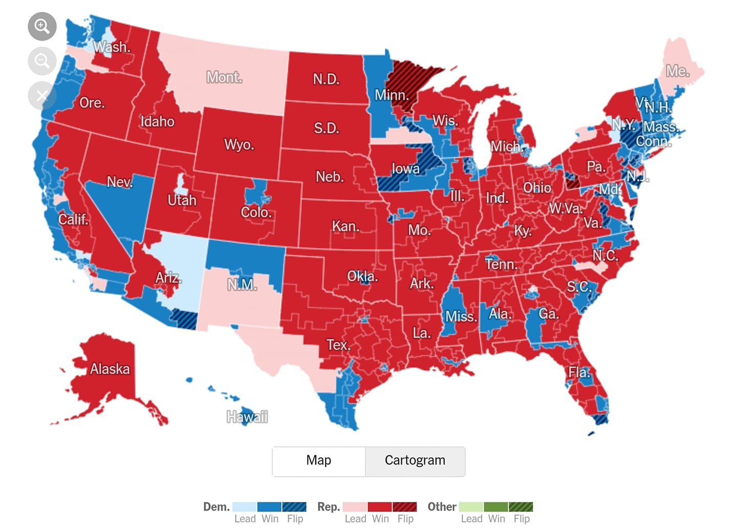 Победата с 2:1 идва от убедителните резултати на републиканците и подкрепяните от Тръмп кандидати на партията за губeрнатори ("президентите" на отделните щати). В мнозинството изпълнителната власт се запазва за републиканците. Вероятно ще изгубят Уисконсин, но удържаха позициите в Масачусетс, Ню Хемпшир и - особено важно! - във Флорида.