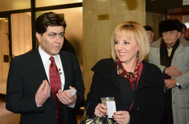 Корнелия Нинова и Красимир Премянов искрено се веселиха с гримирания актьор, Мая Манолова запази присъствие на духа с традиционната си пластмасова чаша кафе в ръка, а Михаил Миков подмина екипа на "Господарите" като малка гара.