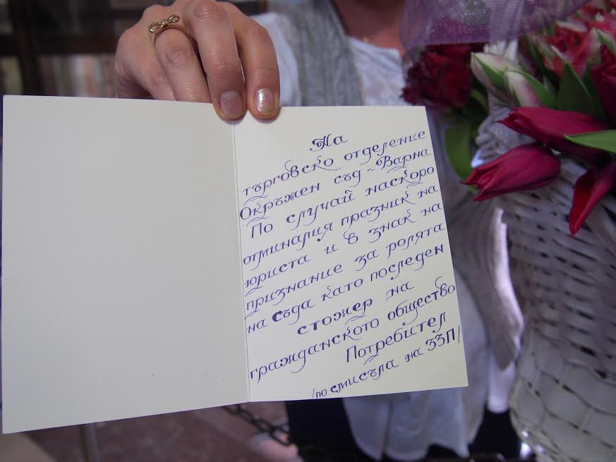 „На Търговско отделение на Окръжен съд Варна по случай наскоро отминалия празник на юриста и в знак на признание за ролята на съда като последен стожер на гражданското общество“, е написано с калиграфски почерк на придружаващата кошницата ръчно изработена картичка. Тя е подписана лаконично - „Потребител“, като е добавено в скоби: „по смисъла на Закона за защита на потребителите“.
