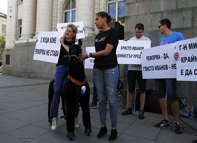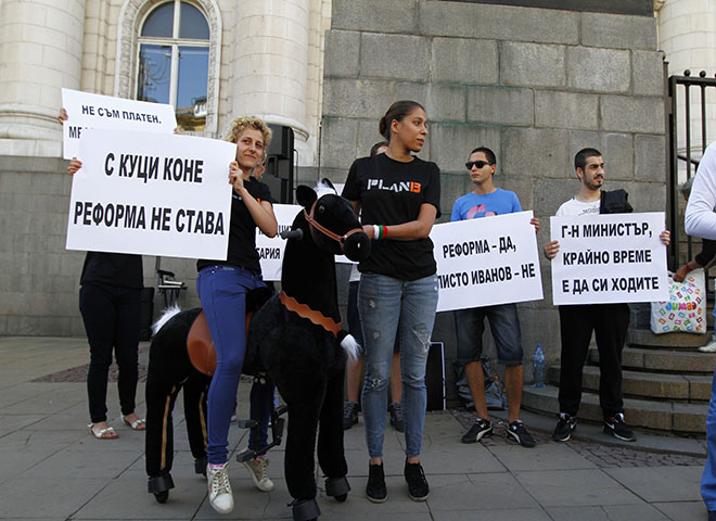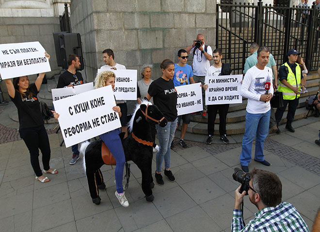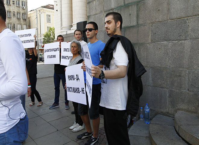 Част от активистите му носят плакати с надписи "С куци коне реформа не става", "Христо Иванов - министър предател", "Реформа - да, Глисто Иванов - не" и др.