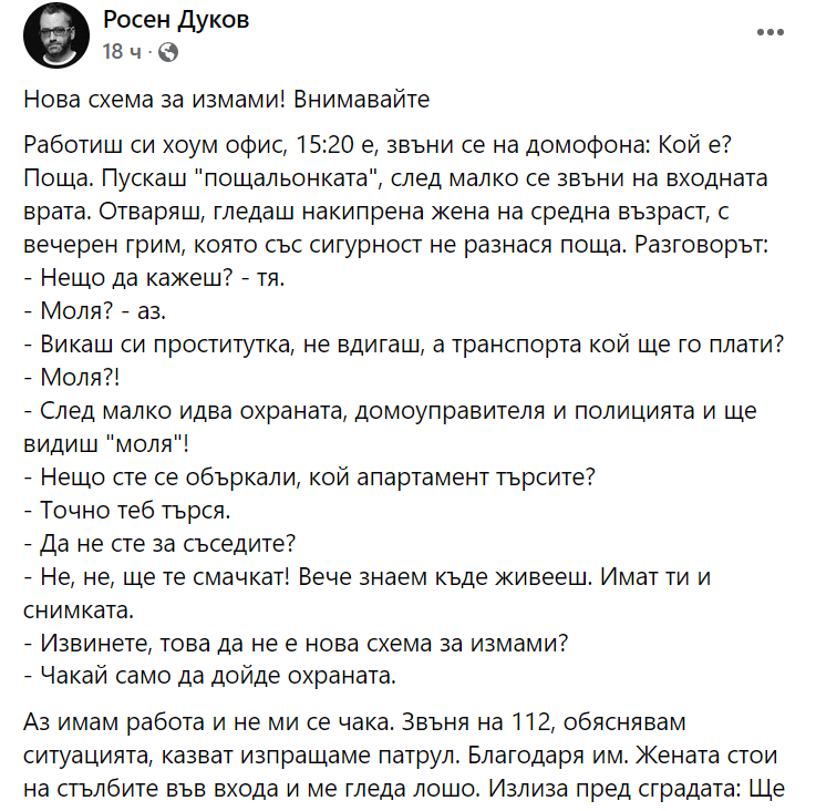 Росен Дуков е графичен дизайнер, създател на визиите на много български филми, книги и музикални албуми. Той разказа във Фейсбук профила си за нов вид измама.