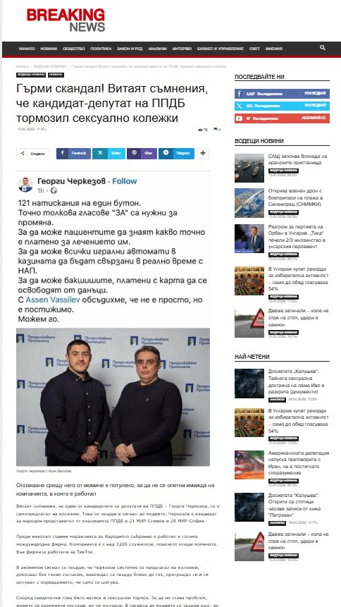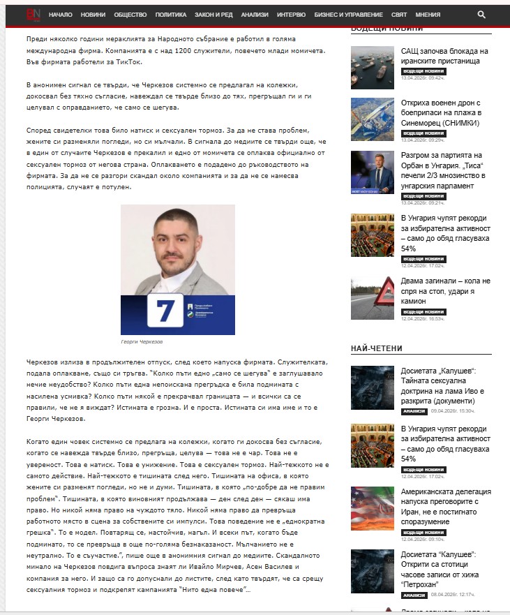 Най-тежкото е тишината след него. Тишината на офиса, в която жените си разменят погледи, но не и думи. Тишината, в която „по-добре да не правим проблем“. Тишината, в която виновният продължава — ден след ден — сякаш има право. Но никой няма право на чуждото тяло. Никой няма право да превръща работното място в сцена за собствените си импулси. Това поведение не е „еднократна грешка“. То е модел. Повтарящ се, настойчив, нагъл. И всеки път, когато бъде подминато, то се превръща в още по-голяма безнаказаност. Мълчанието не е неутрално. То е съучастие.”, пише още в анонимния сигнал до медиите. Скандалното минало на Черкезов повдига въпроса знаят ли Ивайло Мирчев, Асен Василев и компания за него.