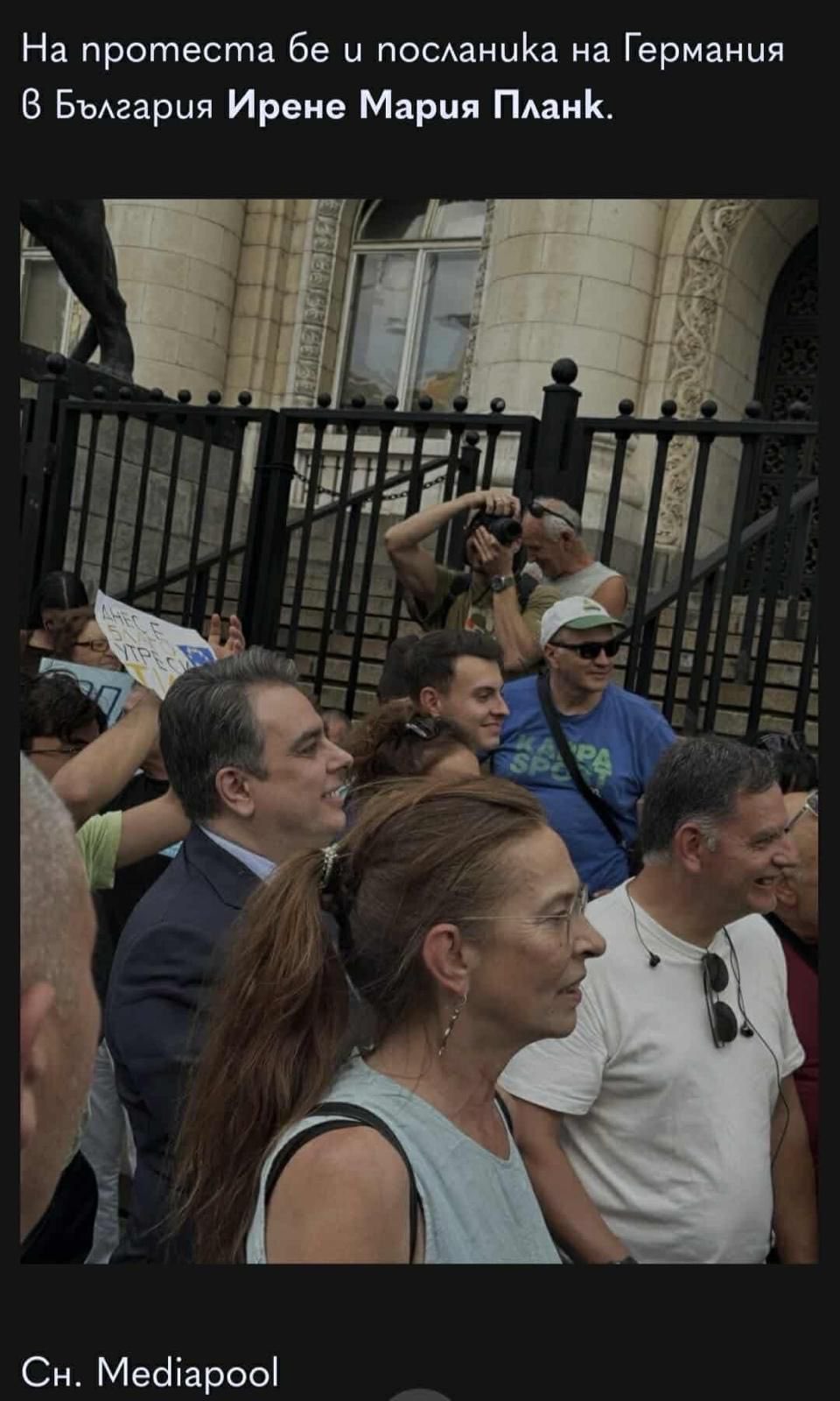 Вчерашната снимка на германската посланичка Ирене Мария Планк, която бе заснета редом до уличения в гигантска корупция Асен Василев пред Съдебната палата, поражда множество въпроси. Освен грозен пример за дипломатическа безвкусица, присъствието на нейно превъзходителство на площада по същество представлява груба намеса във вътрешните работи на една суверена страна, каквато несъмнено е Република България.
