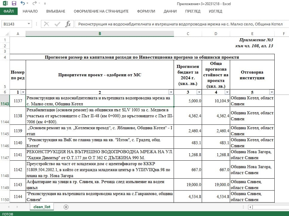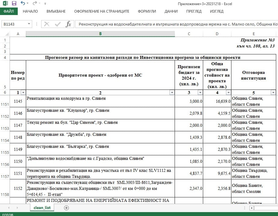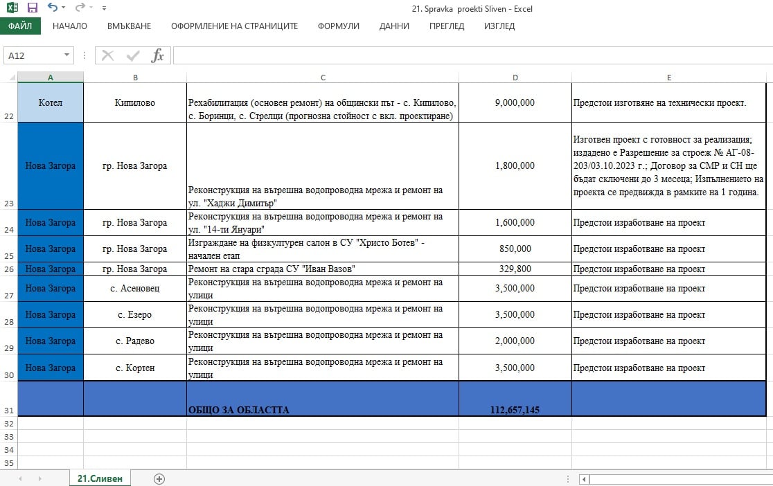 След като в Народното събрание НА 21 ДЕКЕМВРИ 2023 Г. беше окончателно приет Законът за държавния бюджет, 15 проекта за над 80 млн. лв. ще се изпълняват в област Сливен през 2024 г. Най – много са проектите, по които ще се работи в община Сливен. Над 53 млн. лв. са предвидени за осемте проекта в общината. 19 млн. лв. ще се използват за асфалтирането на улиците в кв. „Речица“. 4,5 млн. са предвидени за реконструкция на вътрешната водопроводна мрежа на село Гавраилово. Допълнително водоснабдяване ще бъде изградено и в село Градско. Ще се изпълняват и три проекта за благоустрояване на кварталите „Дружба“, „Българка“ и „Клуцохор“ в Сливен. Заложените средства за тях са над 8 млн. лв. Ще се финансира и цялостното обновяване на Колодрума в Сливен. За възстановяването и превръщането му в многофункционално и модерно съоръжение ще се инвестират над 16 млн. лв. Ще се извърши и текущ ремонт на бул. „Цар Симеон“ в Сливен.