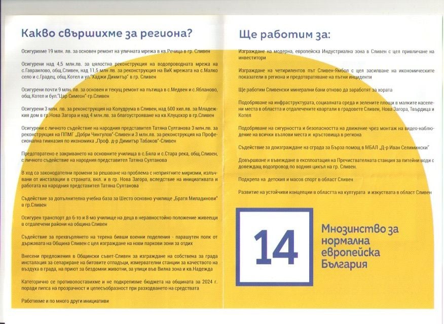 Лъжите на ППДБ в Сливен и водачката им Татяна Султанова край нямат. След като си присвои национални програми предложени от ГЕРБ-СДС още през 2021г., сега наред са общинските проекти. В предизборната си брошура Султанова казва, че благодарение на нея са осигурени над 50 000 000 лв за проекти на четирите общини от областта. В същото време от партийната им централа твърдят, че не 50, а 100 млн са предоставени.