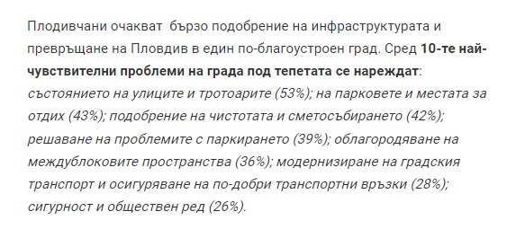 Манипулацията продължи с напълно нереални данни от “проучването”, показващи кои са основните проблеми на Пловдив според гражданите му. Въпреки че всички данни от подобни изследвания в последните месеци показват съвсем различна картина, класацията на телевизията показа, че най-много грижи на пловдивчани създава… чистотата?! Не разкопаните улици и безкрайните ремонти и строежи, не безумният трафик, който къса нервите на всички всеки ден, не липсващият градски транспорт, а чистотата, която в тази ситуация е следствие, а не причина и жителите на града го знаят много добре.