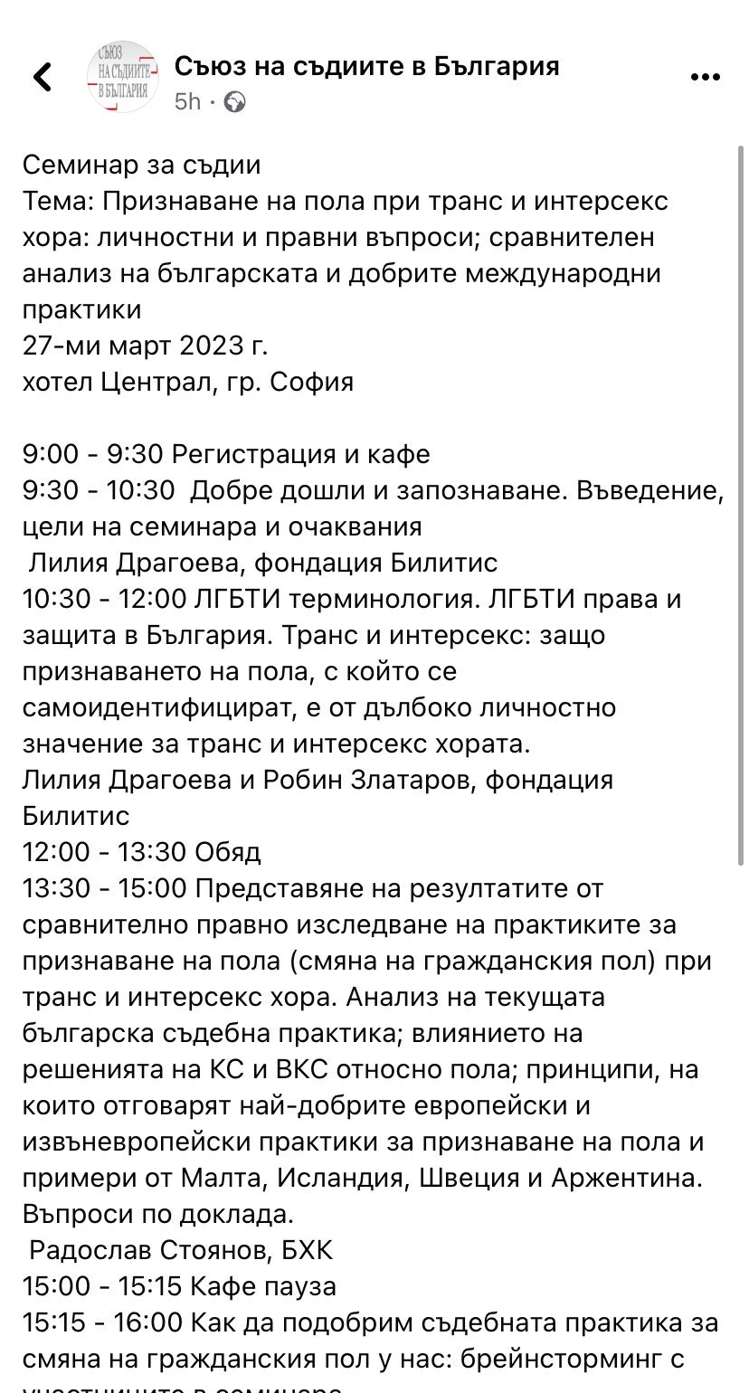 Това се вижда от фейсбук страницата на Съюза на съдиите, въпреки че има тълкувателно решение на Върховния касационен съд, че в личните документи могат да бъдат записвани само два пола - мъжки и женски.