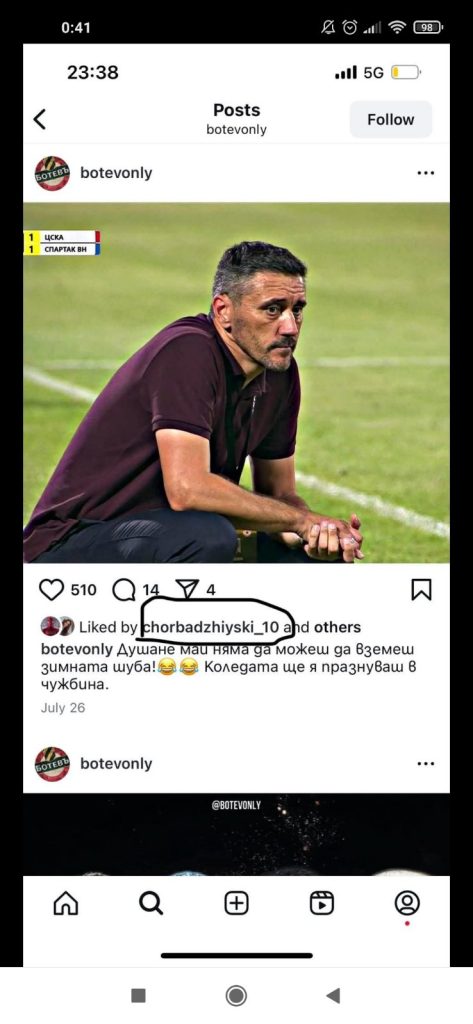 Играчът на ЦСКА Георги Чорбаджийски е харесал в подигравателна публикация в Инстаграм срещу старши треньора на "червените" Душан Керкез. Тя е от 26 юли и от фенски профил на бившия му клуб Ботев Пловдив - botevonly.