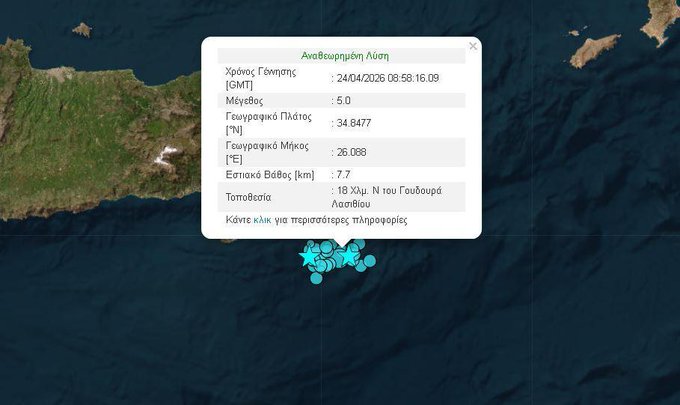 Епицентърът на вторичния трус е бил на около 18 километра южно от Крит, на дълбочина 7,7 километра.