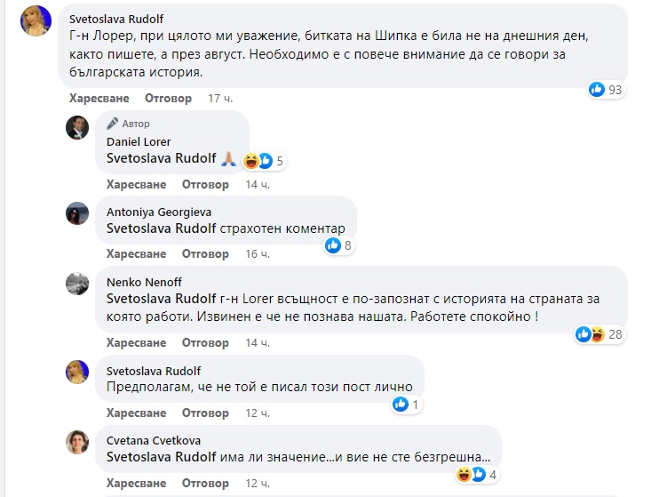 А ето и коментарите под поста, че Лорер е оплескал датите за Битката при Шипка: