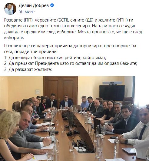 Розовите (ПП), червените (БСП), сините (ДБ) и жълтите (ИТН) ги обединява само едно- властта и келепира. На тази маса се чудят дали да е преди или след изборите. Моята прогноза е, че ще е след изборите.