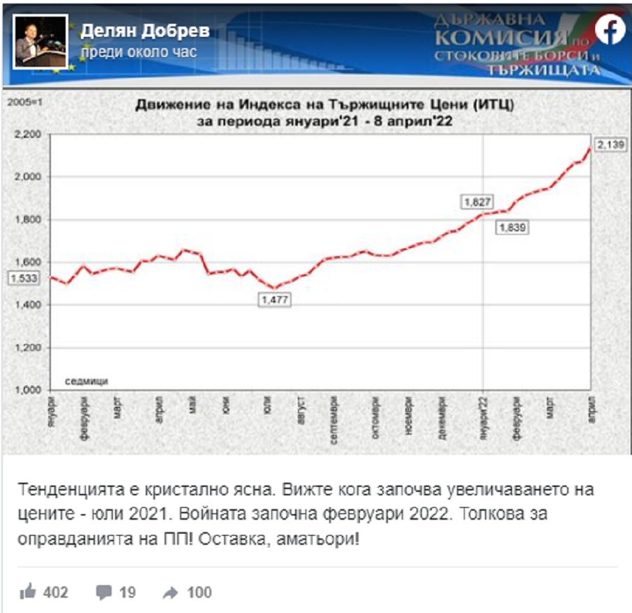 “Тенденцията е кристално ясна. Вижте кога започва увеличаването на цените - юли 2021. Войната започна февруари 2022. Толкова за оправданията на ПП! Оставка, аматьори!“, написа във Фейсбук депутатът от ГЕРБ и бивш енергиен министър Делян Добрев.