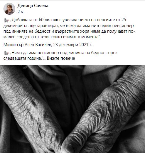 "Очевидно се очертава тежка година." това написа в профила си във "Фейсбук" Деница Сачева. "Питам се, кой ще плати, ако очакванията на възрастните хора отново не се сбъднат? Опозицията, която предупреждаваше във всеки един от случаите, или пенсионерите, за които очевидно се очертава тежка година? Въпросът, разбира се, е риторичен", твърди гневно тя.