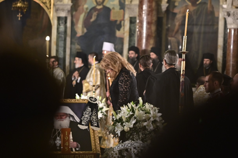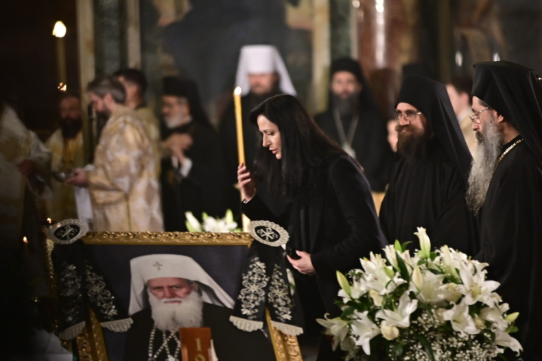 Вътре в храма Денков с траурна лента се поклони пред тленните останки на българския духовен водач и чинно застана до скръбната физиономия на вицето Илияна Йотова. Премиерът в оставка едва успя да успокои дъха си в края на заупокойната света литургия.