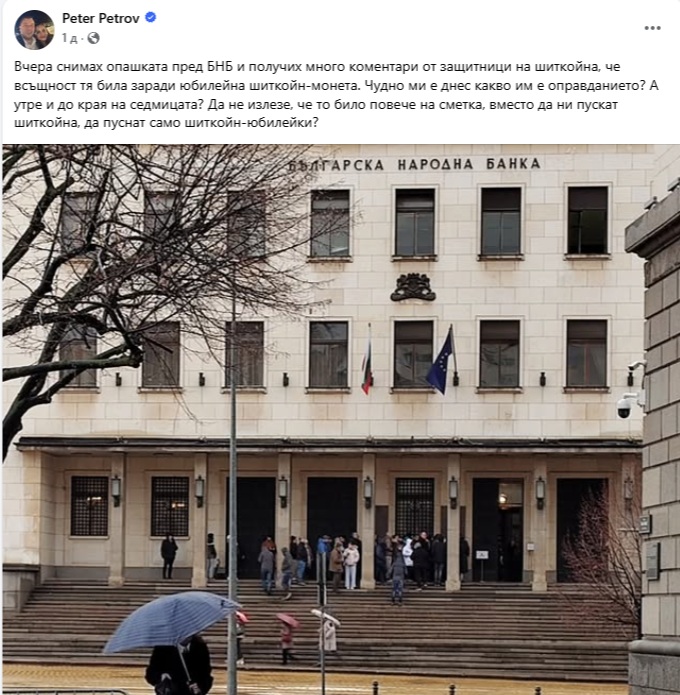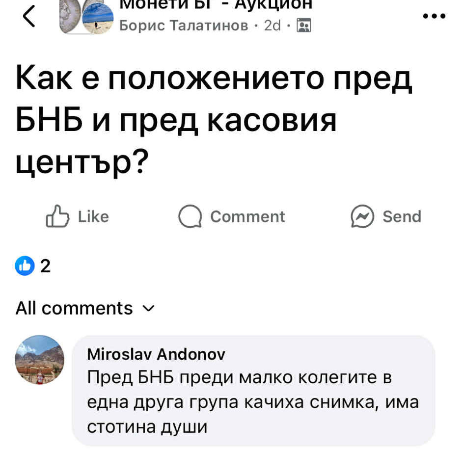 От коментари под публикацията на Петров става ясно, че опашката пред БНБ е именно заради монетата. Според запознати всеки път, когато БНБ пуска колекционерска момента, родни нумизмати се редят с часове пред банката.