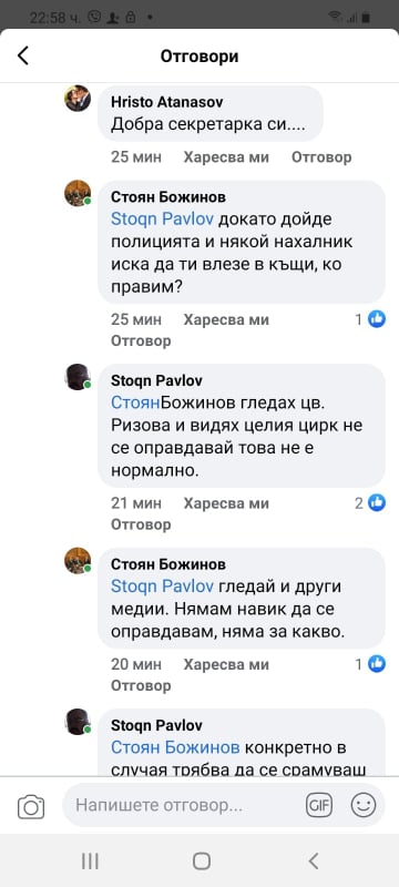 На подобен депутатски каруцарски речник би завидял всеки успоредно с въпроса – какви хора ни представляват в най-висшия орган – Народното събрание. Освен покани-закани за лична среща, депутатът изригна срещу друг потребител на социалната мрежа Фейсбук, вбесен от напомнянето, че българските граждани плащат заплатите на депутатите. В словесната канонада и защита на „войводското поведение“, Стоян Божинов риторично попита „докато дойде полицията и някой нахалник ти влезе вкъщи, ко правим“, а видно от поведението на войводите, отговорът е – саморазправяме се! И най-удачното с пиратки и изливане на течности върху главите.