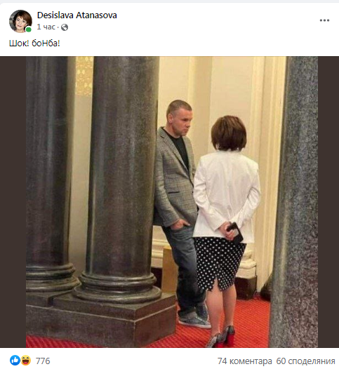 Шок! БоНба! Това написа Десислава Атанасова под снимка, която публикува във Фейсбук. На нея депутатката от ГЕРБ е с Ицо Хазарта от ПП и двамата си хортуват в кулоарите на НС.