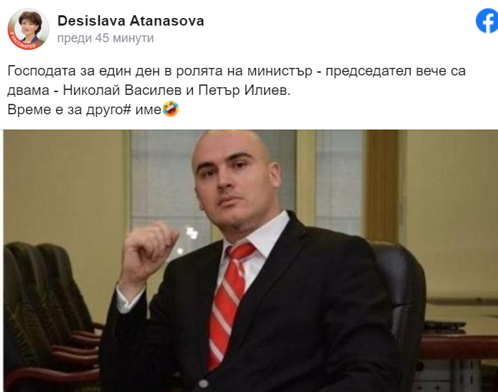 "Господата за един ден в ролята на министър - председател вече са двама - Николай Василев и Петър Илиев. Време е за друго# име".
